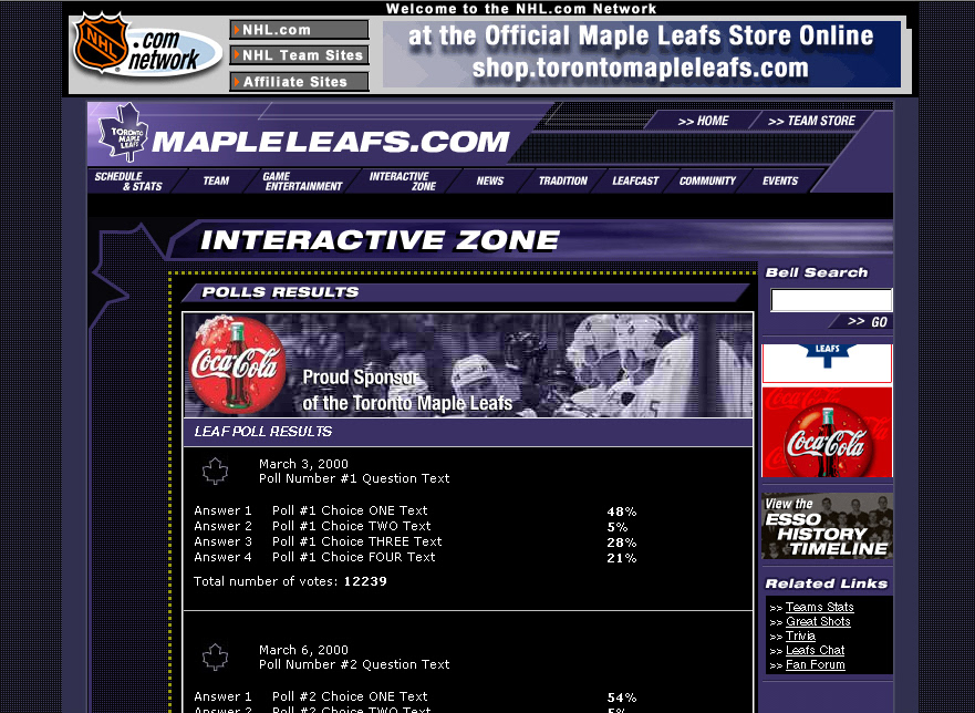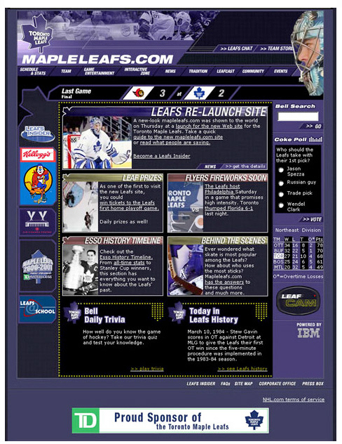 Designed and re-Branded the Toronto Maple Leafs website; including brand extensions of existing and new logos; print, Leafs TV, on-line gaming, contests, social networking, media library, history timeline micro site and sideline merchandising for fan based products and promotional based campaigns. The site was designed and developed to give the “Total Online Fan Experience”.