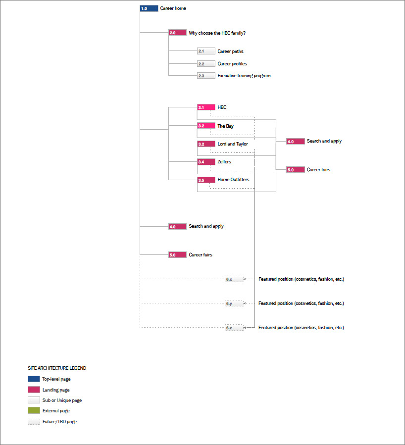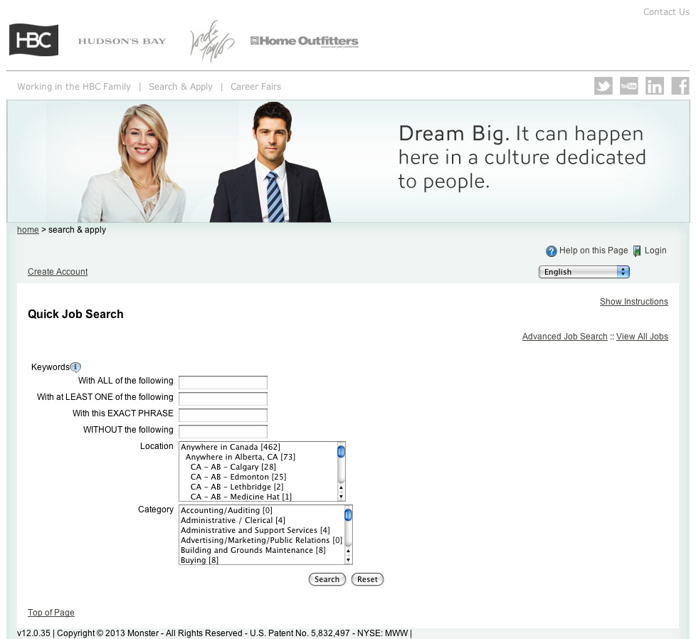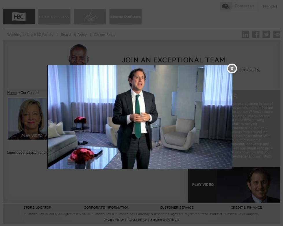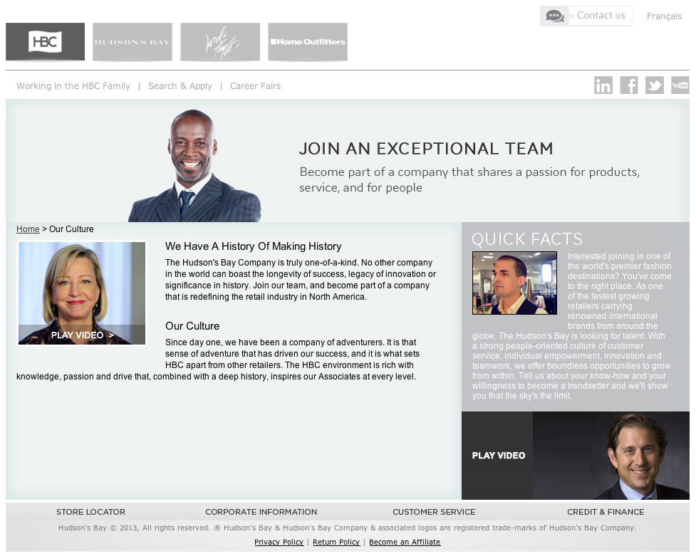 Working with the HBC Marketing and HR teams we designed and developed a strong brand presence that would incorporate all the retail banners that make up the HBC team to promote the diverse career force that lives under these famous world class brands. With corporate headquarters and retail locations from coast to coast in Canada and in nine US states, HBC employs nearly 45,000 talented associates in more than 5,000 different roles. We wanted to represent these associates by using video testimonials and quick facts about the company to give an overall appeal and promote the unique culture to each of the banners and promote new career choices and listings for their online presence, including a mobile version, both sites developed in French and English. From initial design strategy with client, to sitemap, wireframes, creative concepts to final build, the HBC and Monster Teams were an integral part of the design process.