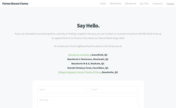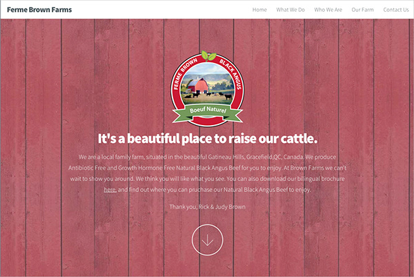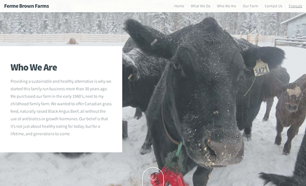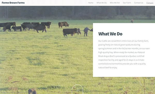 Ferme Brown Farms wanted to brand their farm and product to represent their family farm culture as an all natural Black Angus Beef Farm. We decided on designing the bilingual website as a responsive site brochure style template to promote their product and lifestyle that would also be consistent with the rest of the visual identity, packaging and marketing campaign that we developed. The site was develop in Bootstrap with a minimalist design layout easy to update and add to content.
