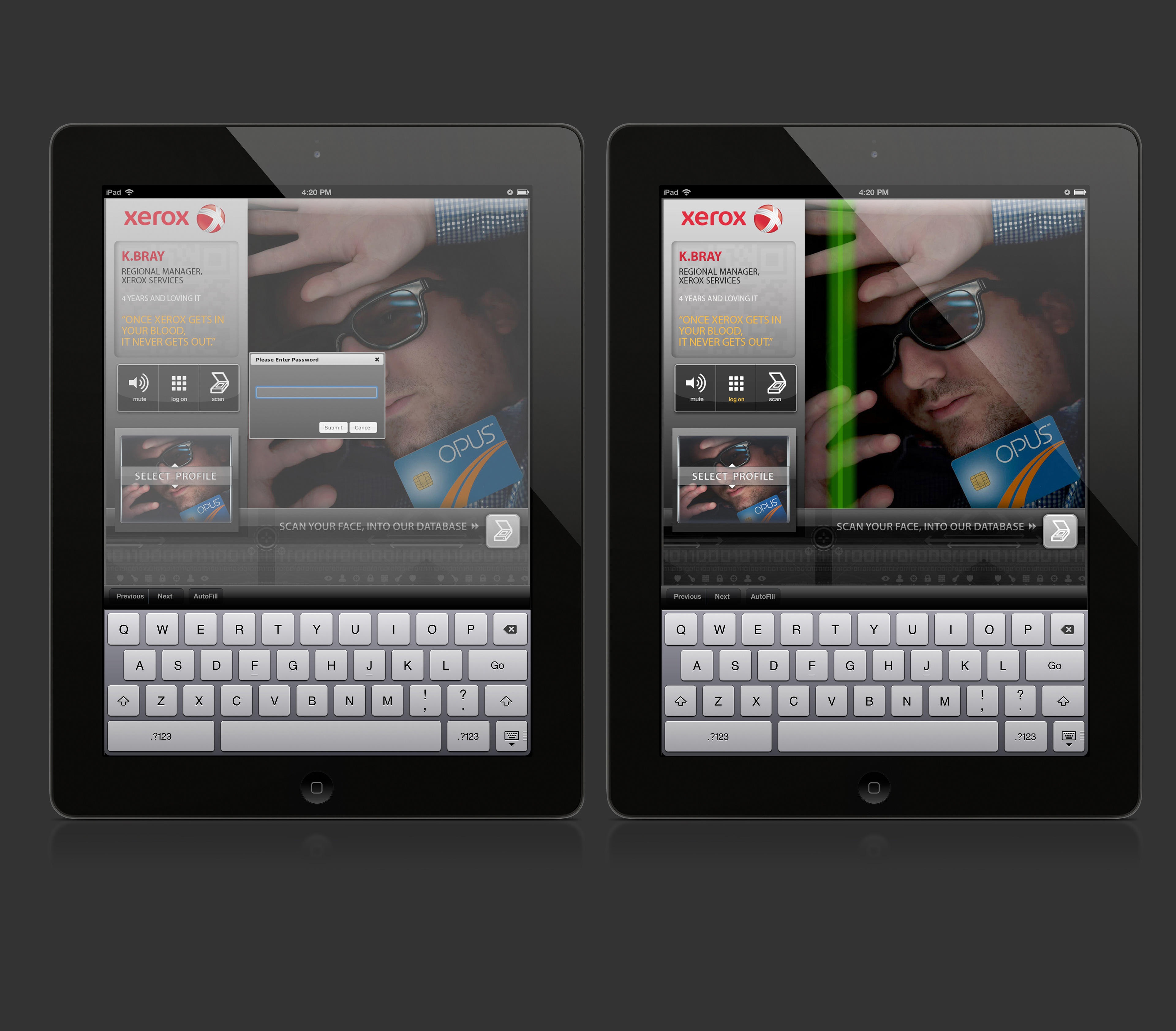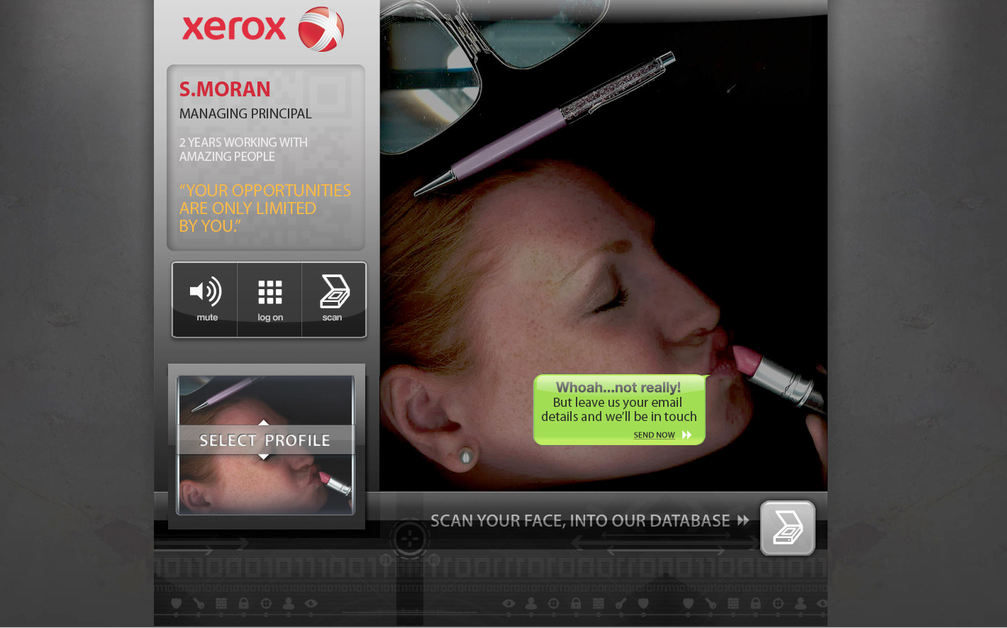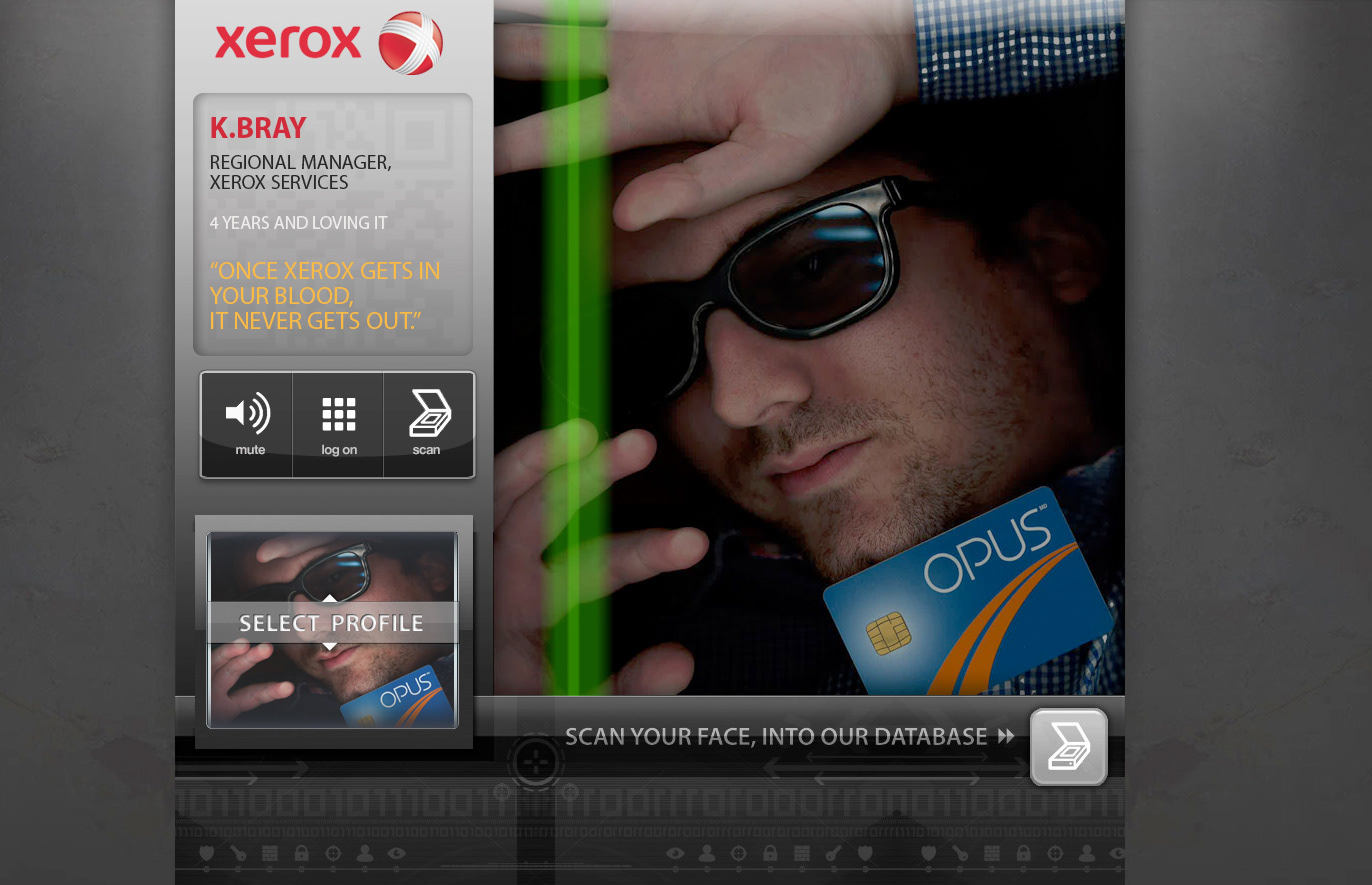 We Designed a customized module for Xerox that could be easily set up as a Kiosk at job fairs to capture recruiting data from potential job seekers. This module also took into account being displayed on multiple devices, such as; mobile, tablet and online. We wanted to have a fun, interactive display depicting actual people who had scanned their image profile into a colour scanner with objects they felt best represented who they were, a digital "self-portrait".